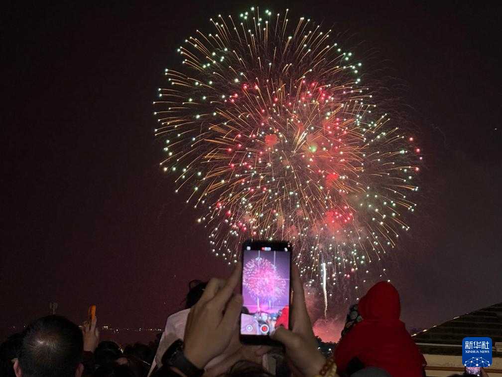 台胞彭欧雅在厦门生活已近30年,今年是她第一次和台湾的家人一同在厦门观看焰火晚会。现场观赏之余,她还通过视频连线,把绚烂的焰火分享给岛内的亲朋好友。